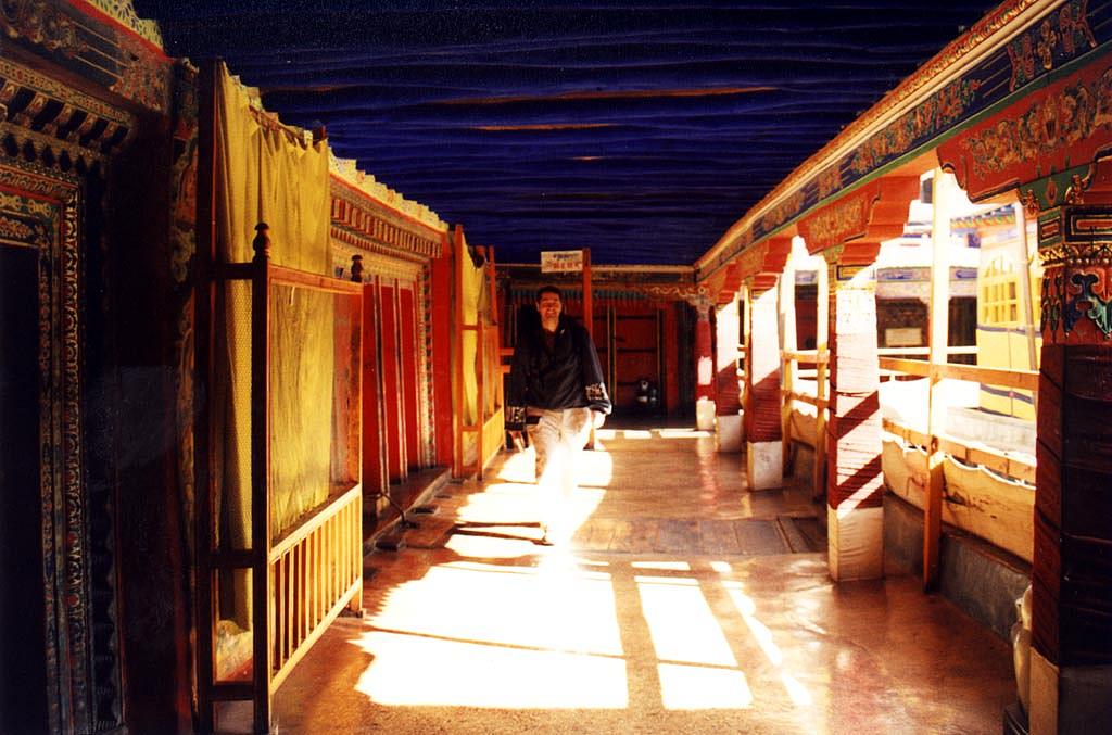 | L'auteur dans une coursive colorée. Noter les motifs sur les portes, poteaux et plafond. Ils sont peints à la main et il y en a comme cela dans toutes les salles que nous avons visitées. |