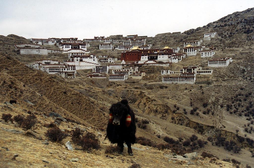| Le village monastère (dont on voit les pagodes dorées) de Ganden accroché à flan de sommet. Un yak solitaire qui passait par-là tenait absolument à faire partie de la photo... Le site de Tazarat affiche la même photo prise durant l'été. |