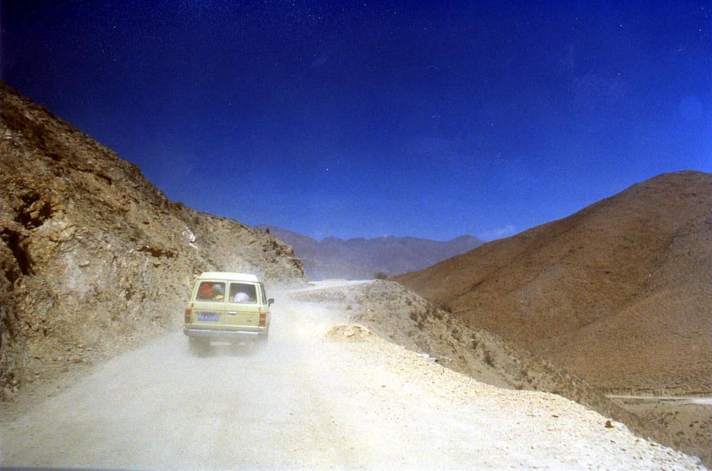 Nous partons de l'hôtel tôt le matin dans quatre vieux Toyota Landcruiser (250,000km au compteur!) surchargé de matériel. Tous sont conduits par un chauffeur chinois pas très bavard. En fait, les seuls mots qu'ils comprennent (ou font semblant de comprendre, nous avons eu d'intéressantes discussions là-dessus...) sont "GO" et "STOP", très utile pour les pauses pipi. Rapidement la route asphaltée (qu'on désigne autoroute sur les cartes mais correspondant plutôt à une de nos routes de campagne) laisse place à un étroit chemin de pierres qui monte en s'accrochant au flanc d'une vallée majestueuse. Le style de conduite des chauffeurs varie considérablement (nous les désignons par; "le prudent", "le stressé", "le pépère" et "celui qui se fait sécher les dents", mais ils ont tous en commun qu'ils connaissent parfaitement bien chaque recoin de la route. Ce n'est malheureusement pas le cas de nous et les parcours à 3 centimètres du précipice me paraissent terriblement longs. J'ai l'impression que la jeep va faire un abrupt plongeon à chaque tournant! J'essaie quand même de rester stoïque, en blaguant et regardant au loin mais dans le fond de moi-même je suis terrifié. René a bien résumé ceci par le fait que "ses dents sont collées ensemble" tellement le stress nous fait serrer la mâchoire! Et Claude-André qui nous averti que ce que nous vivons n'est vraiment rien à coté de ce qui nous attend à la sortie du Tibet! (et il ne mentait pas...)