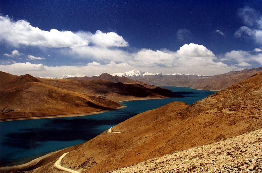 | Magnifique vue sur le Yamdrok Tso. La numérisation de la photo n'a pas trop modifié la fantastique couleur azure de ce lac. Au loin, des pics enneigés de 7000 mètres d'altitude montent la garde. |