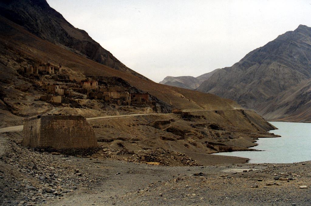 | Village abandonné sur la route de Shigatse. Malgré la présence d'un lac, le paysage reste désertique. Pas un seul brin d'herbe, rien que des roches. |