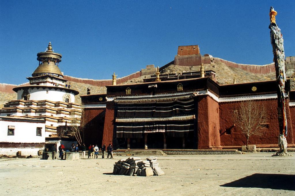 Le matin suivant, nous marchons à travers la section tibétaine jusqu'au monastère de Pelkor Chode, vieux de près de 600 ans. Il est encore très tôt le matin, le soleil plombant reste en partie caché par le Dzong, véritable forteresse perchée sur le sommet d'un pic rocheux en plein milieu de la ville. Les rues sont encore quasi-désertes et nous regardons les typiques maisons tibétaines bordant la grande allée de terre où nous marchons.