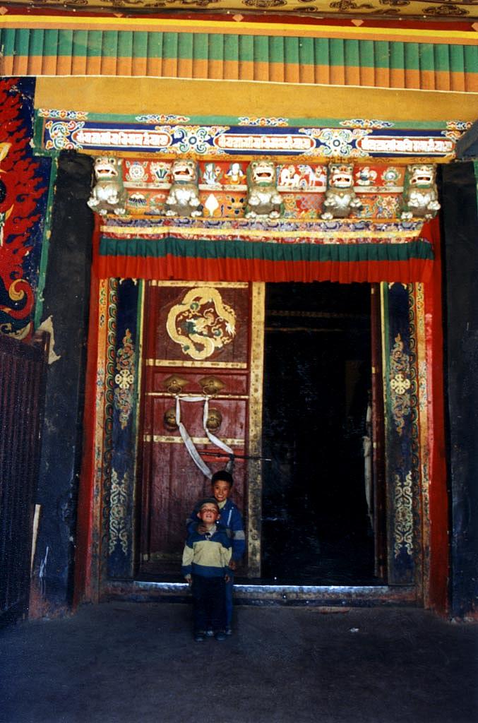 Arrivés au monastère, Tashi et ses monotones explications me font rapidement perdre le compte des (très) nombreuses divinités bouddhistes et j'avoue que cela commence à m'ennuyer un peu. Je pars donc à l'écart du groupe pour visiter seul le temple principal et tombe sur deux gamins qui me guident à travers l'énorme et sombre salle. Ici (comme dans tous les monastères au Tibet), il faut payer pour pouvoir prendre des photos pour chaque salle, ce que nous nous sommes refusés par principe. Cependant, avec le recul, je crois que j'aurais dû au moins prendre quelques photos des endroits les plus imposants.