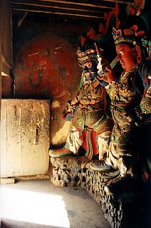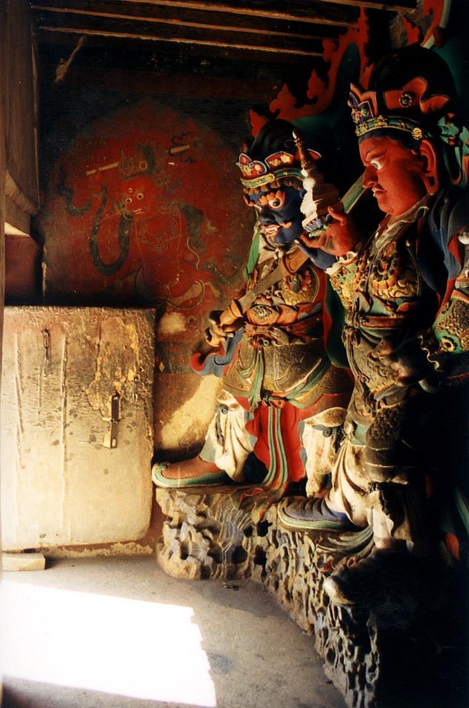 | Les gardiens silencieux de Kumbum montent la garde près d'une entrée. |