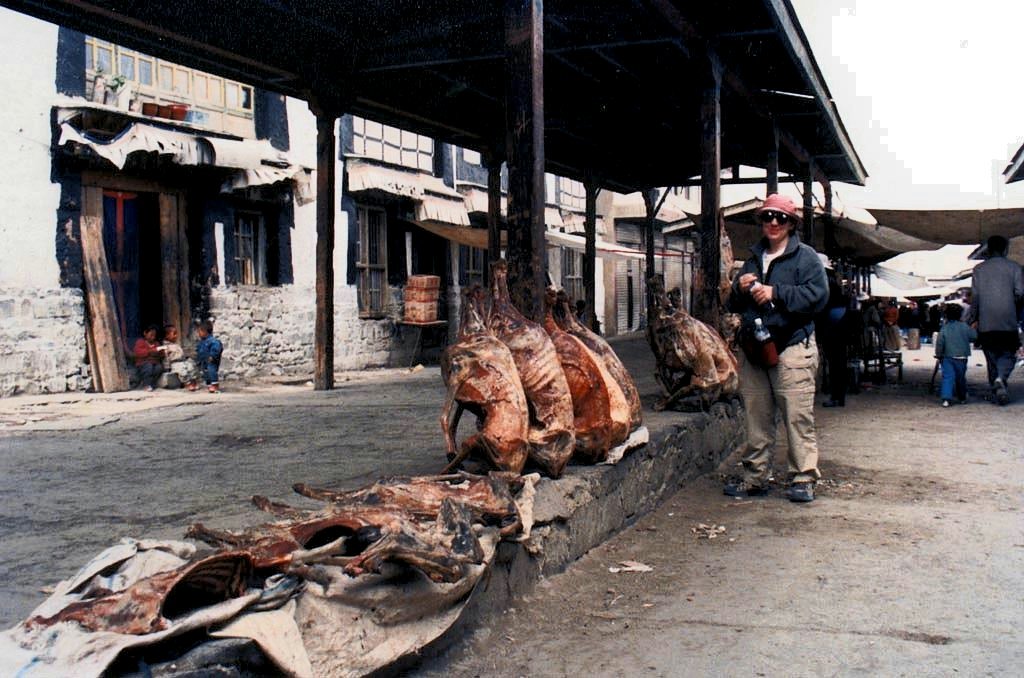 | Le marché de Shigatse. Elyse magasinant pour des carcasses de moutons séchés. Un petit méchoui peut-être? |