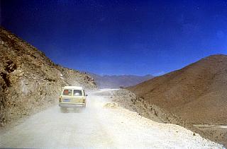 La route longe le lac s'élevant parfois à plus d'une centaine de mètres de la surface. Les conducteurs ne ralentissent même pas lors des nombreux tournants d'où peut surgir à tout instant un camion de ravitaillement chinois roulant en sens inverse. Nous trouvons justement un de ceux-ci arrêté sur le bord de la route, la bloquant sur la moitié de sa largeur. Et voilà notre chinois qui, sans ralentir, essaye de passer quand même! On était quatre à crier "STOP!" cette fois! Nous faisons le passage à pied et regardons la Toyota s'engager centimètres par centimètres, une roue partiellement dans le vide...