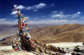 | Drapeaux à prières au sommet du col de Kamba La. Il y a un très fort (et glacial) vent. On aperçoit au loin la route que nous venons d'emprunter pour monter jusque là. |