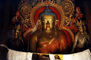 | Imposant Bouddha recouvert de feuilles d'or dans une des pièces de la stupa de Kumbum. |