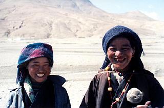 | Deux tibétaines rencontrées lors d'un bris mécanique sur l'un de nos véhicules. Elles étaient particulièrement impressionnées par la caméra vidéo de Darek. |