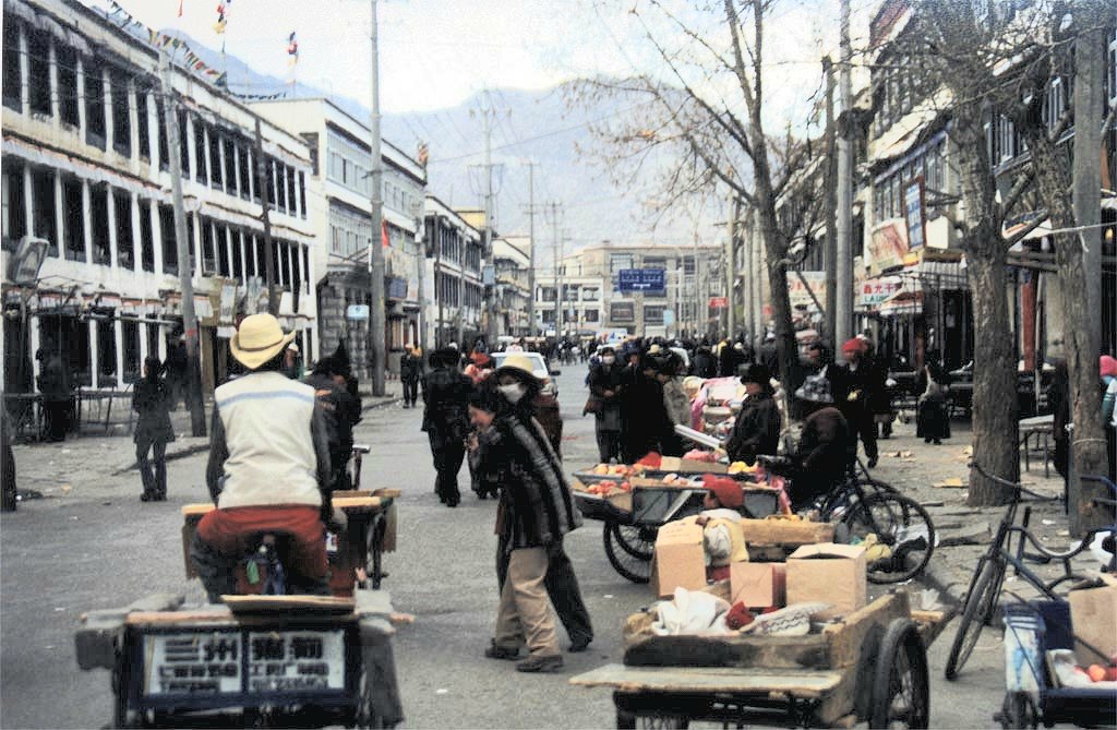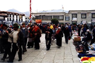 La topologie ouverte de la ville de Lhassa contraste fortement avec celle étouffante de Kathmandu. Les rues et trottoirs sont larges, la circulation beaucoup moins dense et chaotique. Après avoir laissé nos bagages à notre hôtel, où une montée rapide de l'escalier menant à nos chambres nous rappelle immédiatement le manque d'oxygène, nous allons nous promener sur la place du marché, le Barkhor, situé juste en face du monastère du Jokhang. Des marchandises de toutes sortes sont mises en vente, parfois directement à même le sol, allant des vêtements aux appareils électriques rudimentaires. Les femmes tibétaines sont vraiment belles, drapées dans leurs colorés costumes traditionnels. En face du Jokhang, tibétains de tous âges se prosternent par terre en récitant monotonnement prières et incantations, sous l'oeil discret de militaires chinois.