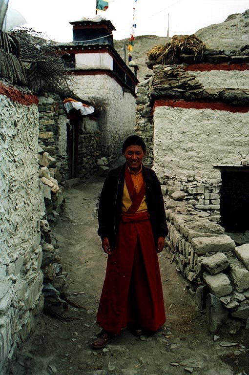 La cérémonie à laquelle nous voulions assister est déjà terminée lorsque nous arrivons. Seuls quelques jeunes moines y sont encore et se prêtent volontiers à une séance de photo avec Elyse. Les hommes tibétains sont très petits, comme on peut s'en apercevoir sur la photo. (Elyse mesure 150cm...) Nous faisons quand même une visite des lieux, la plupart vont faire la cora, un sentier circulaire religieux faisant le tour de la montagne. Fatigué, je reste avec Tashi et un tibétain nous rejoint avec ses deux petits garçons. J'essaie quelques phrases de tibétain (prises dans un livre) à la grande surprise de Tashi qui pouffe de rire. La vue de la photo de ma fille Lauriane me donne droit à de grands yeux étonnés. Ils n'ont pas dû voir souvent de petite fille aux cheveux blonds et aux yeux bleus!.