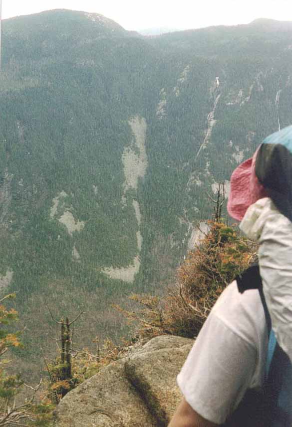 Elyse au premier point de vue. Après 2H00 de montée difficile, une petite ouverture dans la forêt laisse entrevoir la vallée. Il ne faut pas s'approcher trop rapidement car cette ouverture mêne droit sur un très étroit escarpement accroché à même la falaise. Devant nous s'ouvre le gouffre formé par la rivière Malbaie tout en bas. La vue est très spectaculaire mais une mise en garde si vous souffrez de vertige; allez y doucement!!