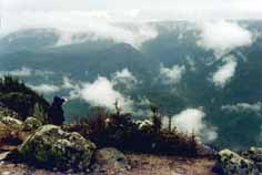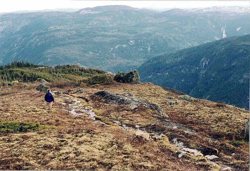 Les arbres se font de plus en plus petits et on peut entendre le vent hurler. La transition de la limite des arbres se fait brusquement, sans avertissement. Nous sommes sur le premier sommet. Devant nous, un gouffre de 800 mètres. Le sentier s'y approche de très près (moins de deux mètres du bord) à deux reprises, ce qui me donne des crises de vertiges épouvantables.