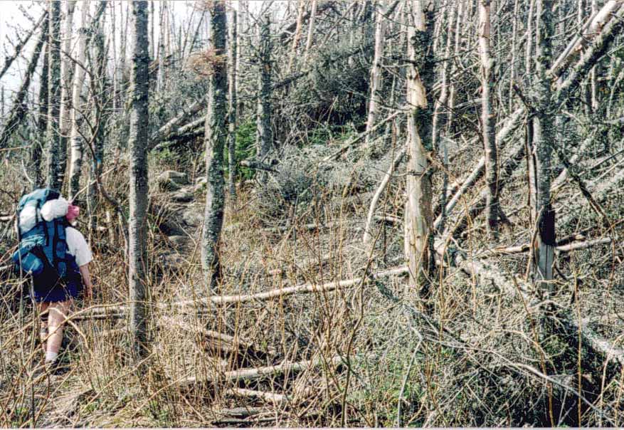 Un peu plus haut sur le sentier les arbres ont été balayés par de forts vents. Ils sont a peu près tous tombés et forment un enchevêtrement incroyable, bloquant la piste complètement. Il nous faudra une demi-heure pour franchir ce dédale avec nos gros sac-à-dos...