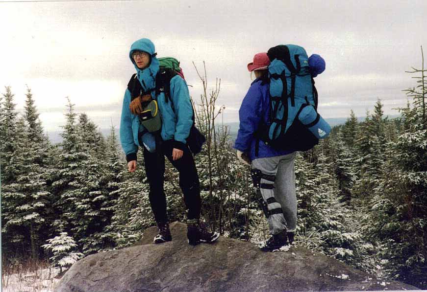 Elyse et Mario sur un des sommets situés sur la piste. Ce ne sont pas de très hautes montagnes comme en témoigne la végétation au alentour, les plus hautes atteignant peut être 500 mètres d'altitude. Il faut quand même porter tout l'équipement sur soit. Et dans cette neige c'est assez épuisant.