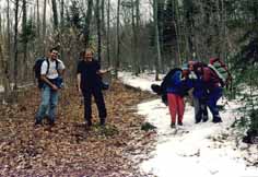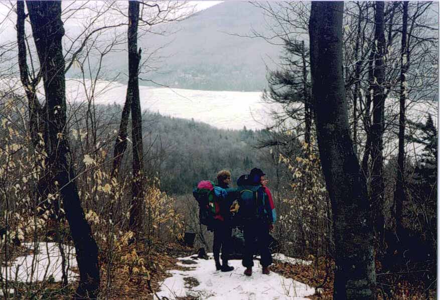Le petit groupe (ici Mario et Denis) surplombe un lac encore gelé. Nous sommes en route pour le refuge du... On pouvait apperçevoir, dans la brume et dominant les autres montagnes avoisinantes de ses 980 mètres, le sommet tout blanc du Mont-Tremblant.