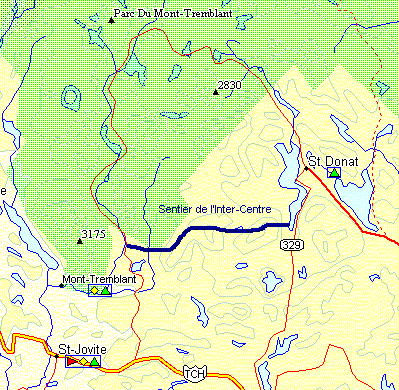 Drôle de photo prise exactement à l'endroit où se trouve la ligne de partage des saisons. A droite (et en montant dans la montagne) on ne trouve que de la neige tandis qu'à gauche commence le printemps. Nous sommes à environ 5 kilomètres de la sortie ouest de la piste, section de la montagne grise, et des chalets de l'université du Québec à Montréal.