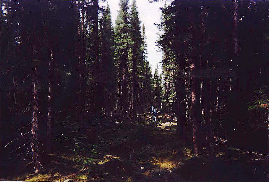 On fait une pause anti-mouches dans une clairière rocailleuse car juste devant nous le sentier semble maintenant s'engager dans une forêt compacte et sombre. Les mouches nous attendent de pied ferme dans cette forêt dense où ne pénètre ni soleil ni vent, et le retour par celle-ci se fait en quatrième vitesse... Nous parcourons en 2h00, sans arrêter, les 6 kilomètres de ce sentier boueux et accidenté. Arrivé à la route, nous sommes heureux de voir que la camionette est là, ayant été conduite à cet endroit par le guide que nous avions rencontré la veille du départ. Pendant que nous attendons Eric et Elyse, 5 (!) voitures nous croisent en 15 minutes sur cette route perdue. Aucun problème pour faire du pouce! Il faut cependant dire que c'est vendredi soir.