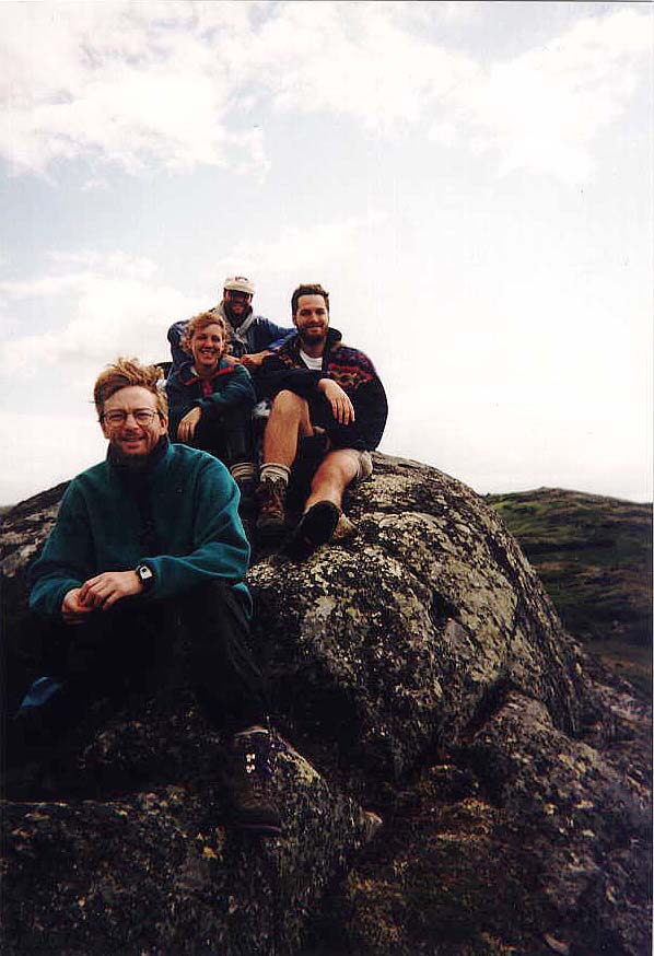 On entend gueuler! Ils ont dû trouver le sentier! Nous nous élançons en direction du son. On peut apercevoir Elyse gesticuler et nous montrer du doigt deux minuscules silhouettes revenant du plateau juste au nord d'où nous sommes... C'est Eric et Nathalie qui, par signes, nous indiquent le plateau derrière eux. Nous voyons maintenant! Au loin, minuscule sur la crête, il y a une chaîne de caïrns: le sentier! Maintenant que c'est réglé, nous passons tous à la bouffe et finissons rapidement les restes des dîners précédents.
