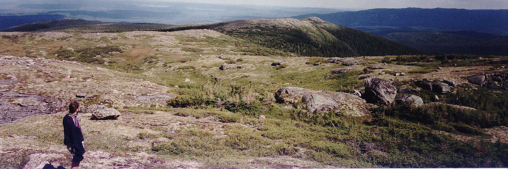 La dernière montée de l'expédition, à travers buissons et arbustes, nous ammène sur un vaste plateau rocheux où talles de bleuets et blocs de roches se disputent la place. La priorité est tout d'abord mise sur la recherche du sentier et nous nous séparons en trois groupes de manière à maximiser nos chances de réussite. Nathalie et Eric vont vers le nord, je pars avec Mario en direction ouest vers le mont Jauffret, tandis qu'Elyse longera le bord du plateau où nous sommes situés. Nous avancons tout d'abord à travers une cuvette boueuse menant à une petite vallée très encaissée, (100 mètres de largeur par 50 mètres de hauteur), qui nous sépare du mont Jauffret lui-même. Hmmm... On n'a encore rien vu qui ressemble de près ou de loin à un sentier et ça ne nous tente vraiment pas de monter jusqu'au sommet du Jauffret...