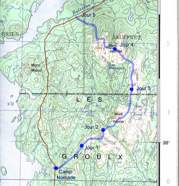 Nous avons parcouru près de 45 kilomètres sur le massif des Monts Groulx. Le journal que vous allez lire a été écrit au jour le jour lors de l'expédition. C'est donc à un point de vue "en direct" que je vous invite et j'espère qu'il saura vous faire partager les émotions et misères de notre expédition.