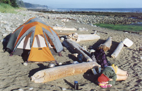 Tous les campings sont situés sur les plages, à proximité de cours d'eau se jettant dans la mer. Nous sommes ici au camping de Michigan Creek, du nom d'un navire à vapeur s'y étant échoué en 1893. On installe tout simplement sa tente n'importe où sur la plage. Il faut cependant être prudent et consulter les tables de marées ainsi que les prévisions météo de la nuit! La photo montre la vue du littoral vers le sud, que nous avons emprunté le lendemain matin.