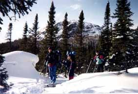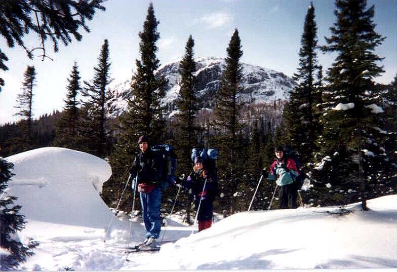 Nous nous arrêtons au trois quart de la montée et dînons allignés à même la piste. Quelques uns d'entre nous en profitent pour enlever leurs skis. Ils n'iront pas loin! La neige leur monte facilement jusqu'à la mi-cuisse et remonter sur ses skis devient alors tout un exploit. La pause est tout de même de courte durée car il est déjà tard (près de 12H30) et nous n'avons couvert que seulement un tiers de la distance totale que nous avons à faire aujourd'hui. La montée est heureusement assez courte et, malgré un passage particulièrement abrupte et étroit, rapidement négociée. Arrivé en haut, un paysage spectaculaire s'offre à nos yeux.