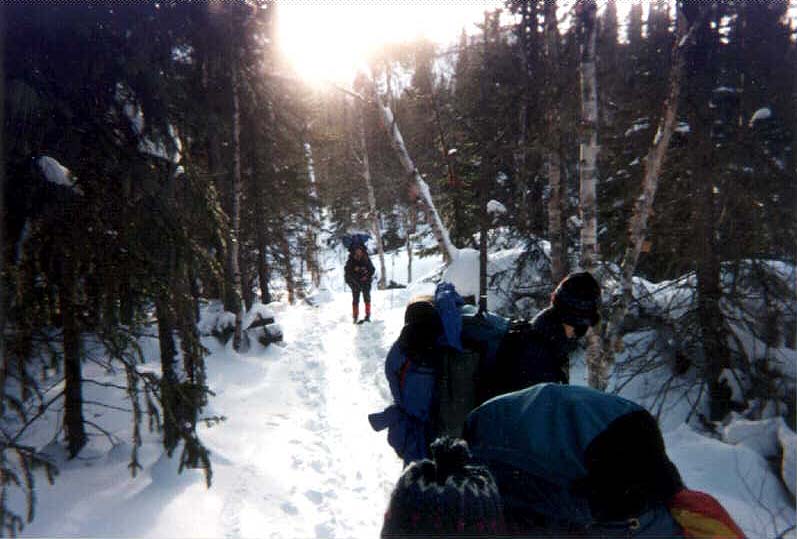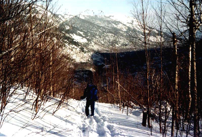 Devant nous se trouve une immense cuvette entourée de petites montagnes et formée par la descente de la rivière du Gouffre. La piste y plonge littéralement. Elle est à peine skiable et ce malgré l'épaisseur de neige folle qui heureusement (cette fois ci du moins!) nous ralentit beaucoup. Nous mettons tous nos peaux à skis dans cette descente infernale, sauf Eric et Julie qui, fidèles à leurs habitudes, dévalent les pentes en trombe et ce non sans quelques chutes spectaculaires. Je ferme la marche avec Blaise et à la moitié de la descente nous croisons un couple d'anglophone qui remontent la pente. Une brève conversation s'engage alors sur la nature de le section de piste qu'il nous reste à faire. Une phrase nous marque: "The worst is still to come" nous répètent-ils sans cesse... Nous les regardons nous dépasser et continuer à monter. Ils sont tous deux très bien équipés et possèdent une bonne technique, ce qui nous fait un peut réfléchir sur ce qui nous attend. Sur la carte pourtant il n'y a rien de bien difficile devant nous. Bien moins difficle que ce que l'on vient de faire depuis le matin. Bizarre... (Nous apprendrons plus tard qu'ils ont dû passer la nuit précedente dans le bois, n'ayant pu attendre le camp Boudreau ou le chalet Marmotte.)
