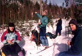 Il y a ici une quantité incroyable de neige!! Près d'un mètre en une seule tempête la fin de semaine dernière. Une fois tombé, il est très difficle de se relever seul. Denis se retrouve même pris dans une espèce de trou où la couche de neige est particulièrement épaisse. Il faudra l'aide de deux d'entre nous pour le sortir de là... Peu de temps après, c'est à mon tour et après quelques vains efforts je commence à comprendre ce que doit ressentir une tortue renversée sur le dos dans une fosse de sable mouvant. Couché dans la neige, empêtré dans mes skis, la moitié du corps enseveli, je cherche en vain un point d'appui. Mes bâtons s'enfoncent presque jusqu'à la garde et du plus profond que je puisse aller avec ma main, rien de solide ne me permet de m'y appuyer. Dès lors pour des raisons de sécurité, rester groupés nous semble être impératif et le groupe, qui s'était étiré sur presque un kilomètre, progressera désormais ensemble.