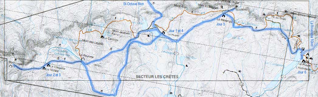 Nous avons parcouru plus de 80 kilomètres sur les sentiers de la section ouest des Chic-Chocs, nommé secteur du mont Logan. Le journal que vous allez lire a été écrit en partie au jour le jour lors de l'expédition. J'espère qu'il vous donnera le goût du ski de fond de longue randonnée (malgré la pluie!!) et qu'il saura vous faire partager les émotions et les misères de notre expédition. Plus de détails techniques sur l'expédition sont également disponibles pour ceux et celles que cela intéresse.