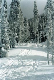 Après un long dîner de 1H30, (impossible de résister à une température si belle!), l'équipe reprend la route. Le sentier monte continuellement, petit à petit, tandis que les heures passent et que le soleil pénèttre de moins en moins profondément dans la forêt. Les pauses se font plus fréquentes et les estimations quant à notre position sur la carte, toujours trop optimiste. Annie et Julie échangent skis et bottines afin de pouvoir se partager une des seules paires de skis hors pistes avec carres que nous avons.