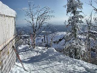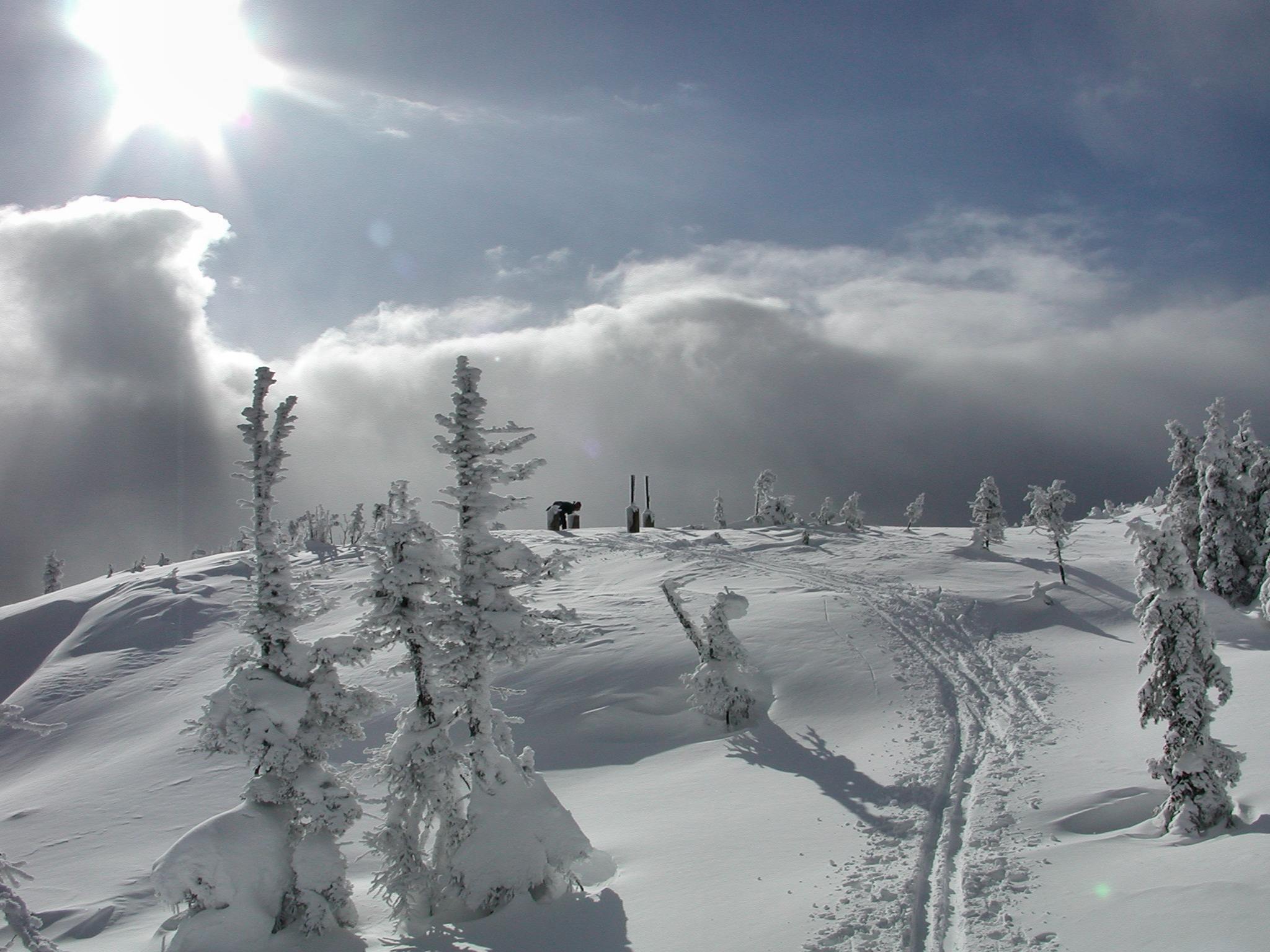 Le sommet dénudé du pic Dubuc. Du sommet on accède à une zone assez dégagée, recouverte de belle neige poudreuse et profonde. Une plateforme surélevée en bois (Aucune idée de ce que cela a pu être. Trop petit à mon avis pour y poser un hélicoptère) permet de se reposer un peu La vue de la vallée en face est spectaculaire, plongeant de plusieurs centaines de mètre. Un vaste système nuageux recouvrait celle-ci, mais curieusement, s'arrêtait juste à la limite du massif où nous nous trouvions.