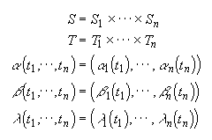 Nous avons une liste de quatre petits systèmes de transitions. L'ordre des systèmes de transitions est important car c'est lui qui nous permettra de décrire les transitions et états globaux sous la forme de liste dont le ième état, ou la ième transition, appartient au ième système de transitions. Par exemple, la transition globale déterminée par les sous-transitions en gras dans le Tableau I.2 est identifiée par la liste (b.a.b.b). Il en va de même pour l'identification des états globaux. Cependant, afin de pouvoir différencier ces derniers de la représentation des transitions globales, leurs listes seront précédées de la lettre e.