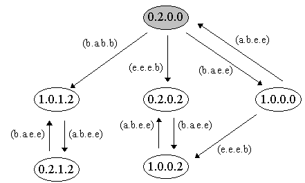 Si on effectue le produit libre de ces quatre systèmes de transitions dans l'ordre, nous obtenons un système de transitions global comportant 48 états et 16 transitions. La figure suivante représente une petite section du système de transitions global, centrée sur l'état global e(0.2.0.0) qui représente l'état courant global, et qui est composé des états courants des sous systèmes de transitions. Les transitions marquées en gras dans les systèmes de transitions du Tableau I.2 représentent une unique transition globale, également marquée en gras, de la Figure I.3.